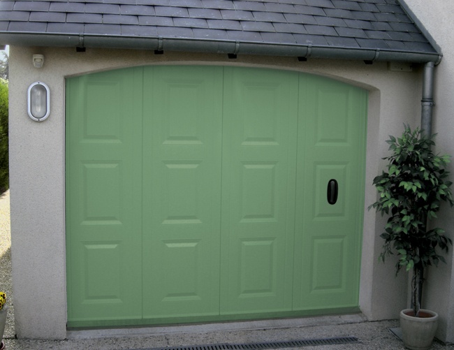 Idéale pour les garages sans électricité, cette porte sectionnelle d’un haut niveau de sécurité propose une ouverture latérale manuelle, avec son portillon piéton pivotant. Très bonne isolation du tablier.