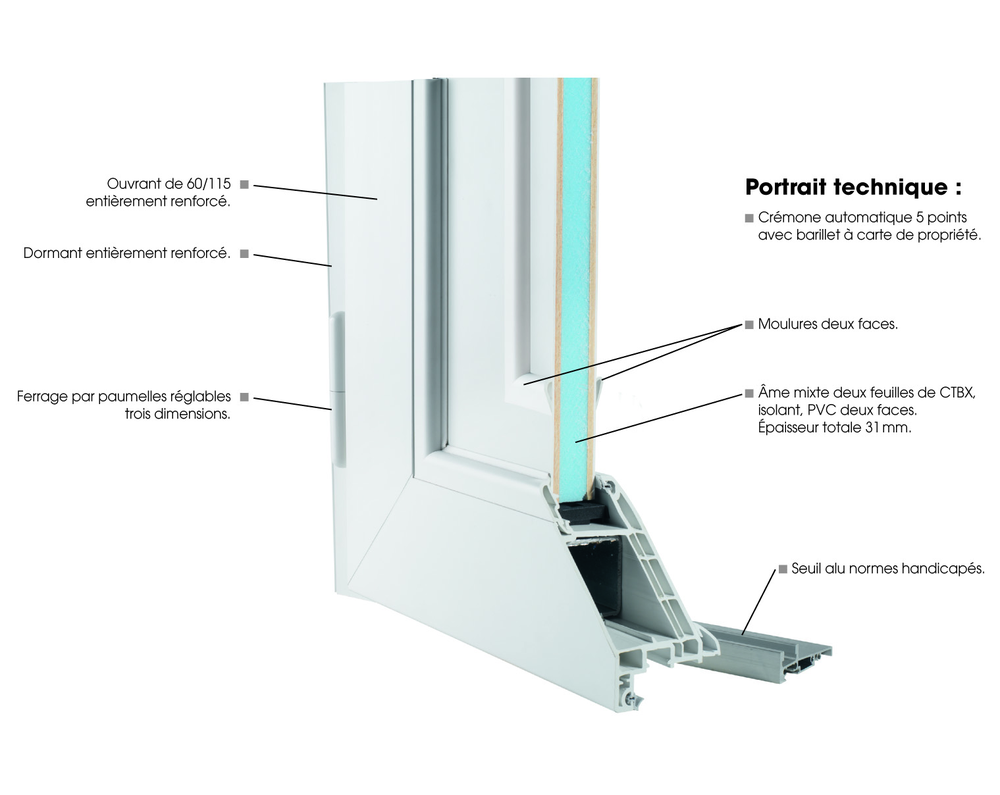 - Ame mixte deux feuilles de CTBX, isolant, PVC 2 faces. Epaisseur totale 31 mm